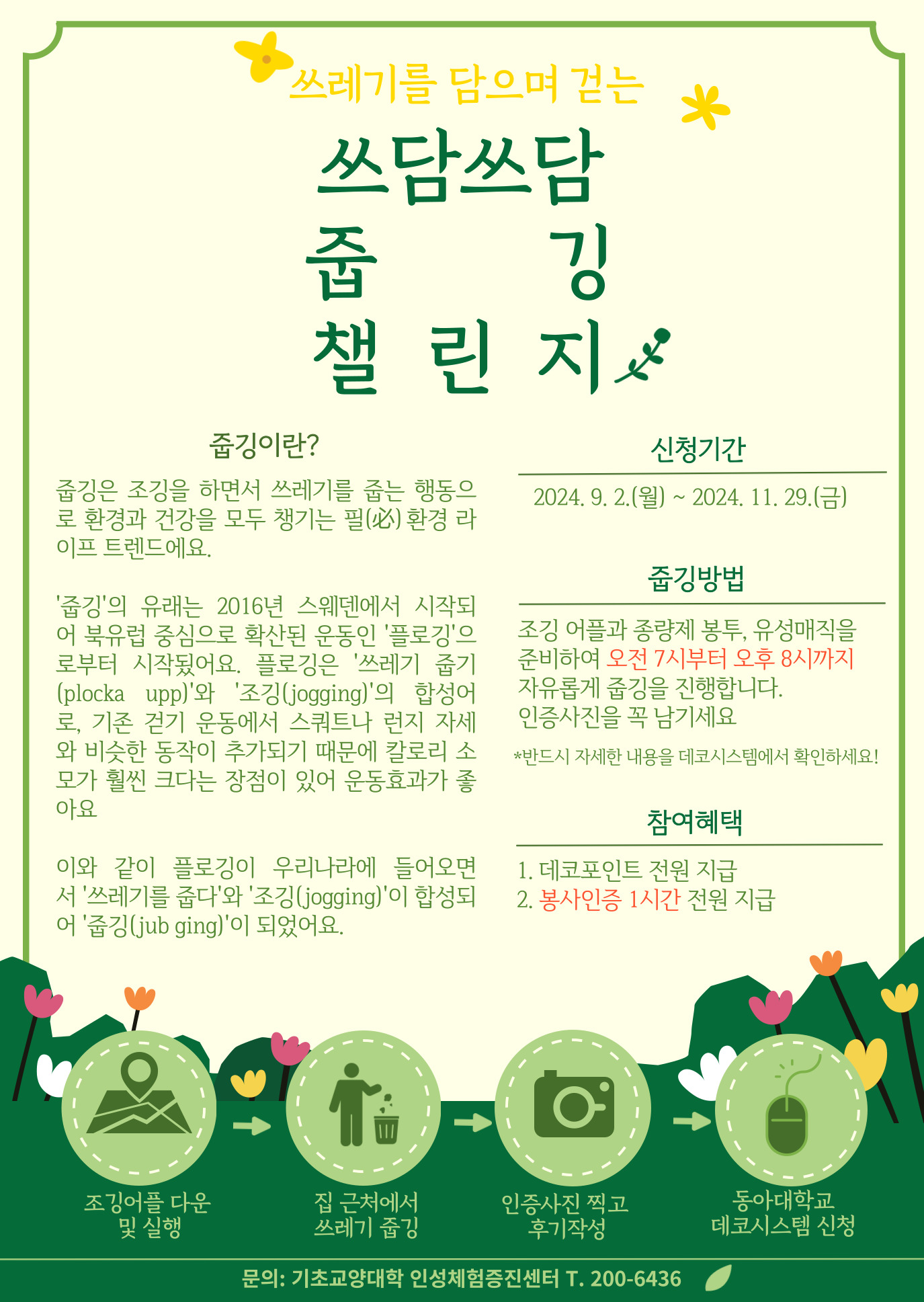 | 준비물 | 종량제 봉투(10L), 조깅 어플, 유성매직, 운동화 등 | 지정 어플 사용 바람