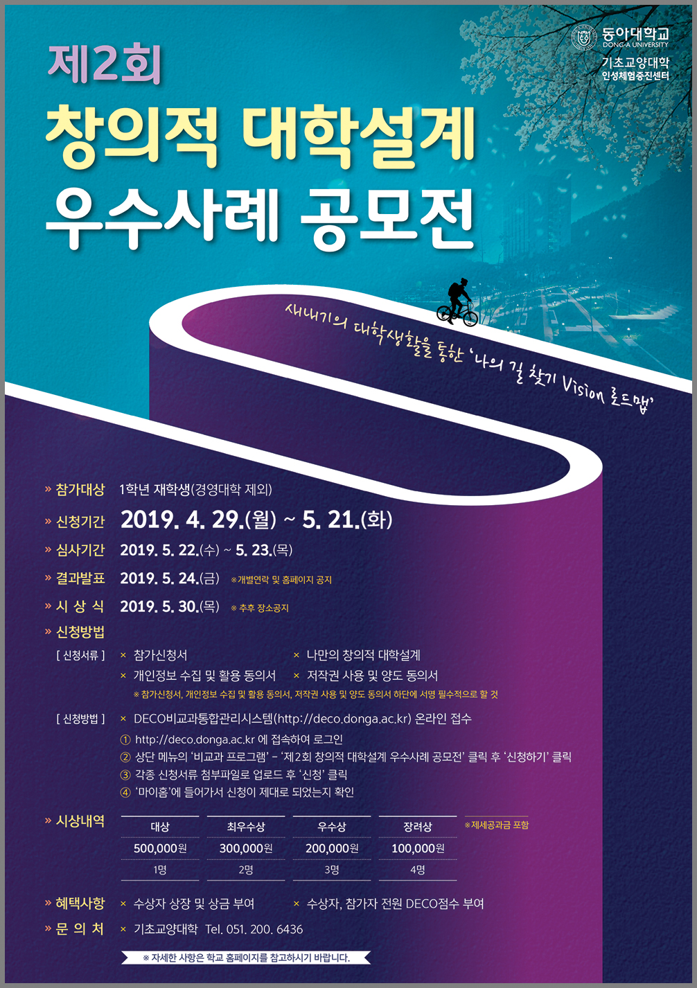 비교과 프로그램 열린 미래 꿈이있는 대학, 동아대학교 메인으로 이동 비교과 프로그램 대학소개 교양교육과정 교양 학사학위과정 특별학점 인정시험 센터소개 커뮤니티 비교과 프로그램 닫기 창의적 대학설계 우수사례 공모전 동좌문도 북클럽 글쓰기 특강 글쓰기 클리닉 독서에세이대회 창의적 대학설계 우수사례 공모전 봉사활동 수기 공모전 교양교육 학생평가단 동아 우수교양 콘테스트 쓰담쓰담 줍깅 챌린지 닫기 비교과 프로그램 비교과 프로그램 동좌문도 북클럽 글쓰기 특강 글쓰기 클리닉 독서에세이대회 창의적 대학설계 우수사례 공모전 봉사활동 수기 공모전 봉사활동 수기 공모전 소개 교양교육 학생평가단 동아 우수교양 콘테스트 쓰담쓰담 줍깅 챌린지 창의적 대학설계 우수사례 공모전 SNS 목록열기 FACEBOOK 공유하기 TWITTER 공유하기 BLOG 공유하기 SNS 목록닫기 인쇄 url 복사 창의적 대학설계 우수사례 공모전 소개 2018 제1회 창의적대학설계 2019 제2회 창의적대학설계 2020 제3회 창의적대학설계 2021 제4회 창의적대학설계 2022 제5회 창의적대학설계 2023 제6회 창의적대학설계 2024 제7회 창의적대학설계 구분성명대학학과소감문대상현*헌글로벌비즈니스대학글로벌비즈니스학과소감문 보기최우수상송*진인문과학대학한국어문학과소감문 보기한*림디자인환경대학산업디자인학과소감문 보기우수상김*수인문과학대학철학생명의료윤리학과소감문 보기장*빈자연과학대학신소재물리학과소감문 보기이*경사회과학대학사회복지학과소감문 보기장려상박*현간호학부간호학과소감문 보기강*서사회과학대학경제학과소감문 보기이*호공과대학기계공학과소감문 보기정*인생명자원과학대학생명자원산업학과소감문 보기